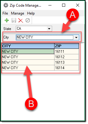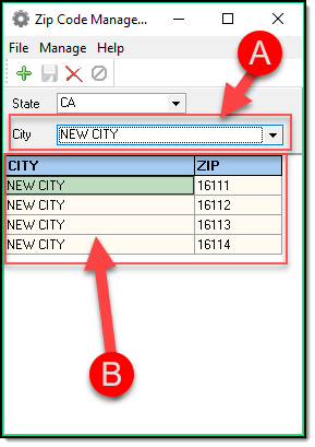 6. Once zip codes have been entered for more than one city, you can use the city drop down list (A) to filter the selections displayed in the Zip code Management grid (B).