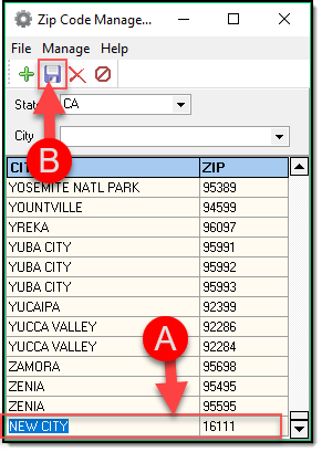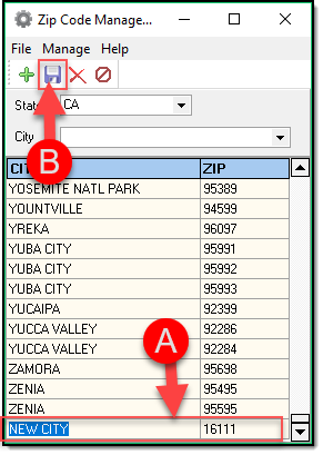 4. Enter the city name and a zip code (A), and then click the “Save” button (B). Make sure to type the city name in all CAPS so that the cities are standardized in the drop down list.