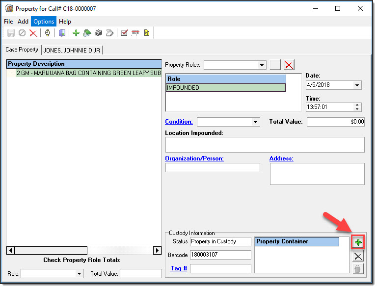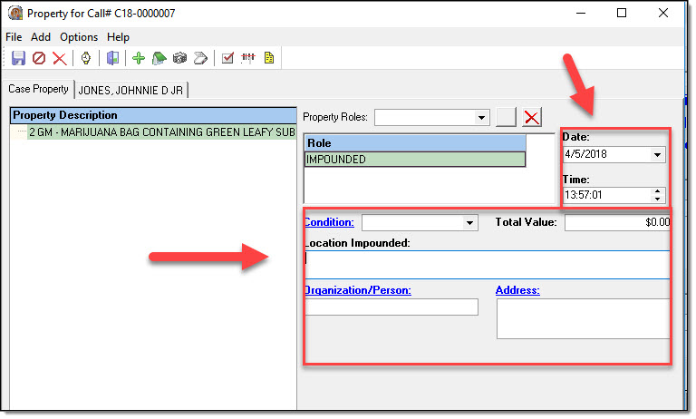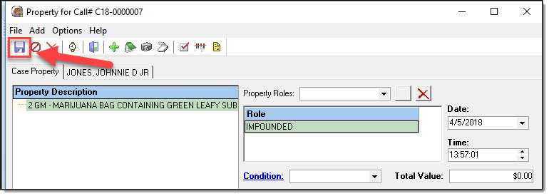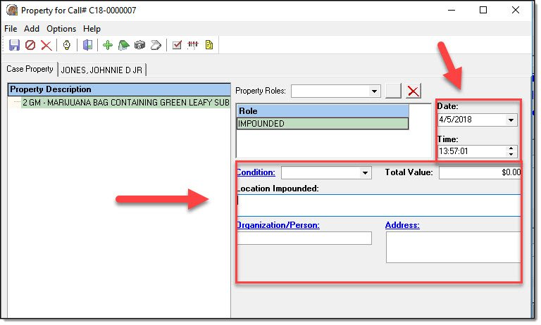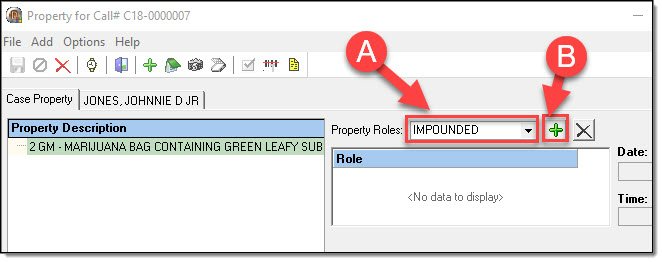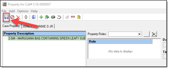 Each piece of property associated to the call-for-service should have at least one associated property role. If you are utilizing the RMS for UCR or IBR reporting purposes, please be aware that certain roles may be required once a call is escalated into a case.