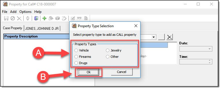 2. Use the radio buttons to select a type of property (A) and then select the “OK” button (B).
