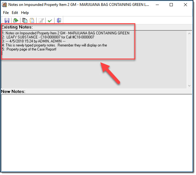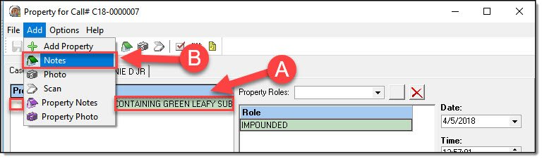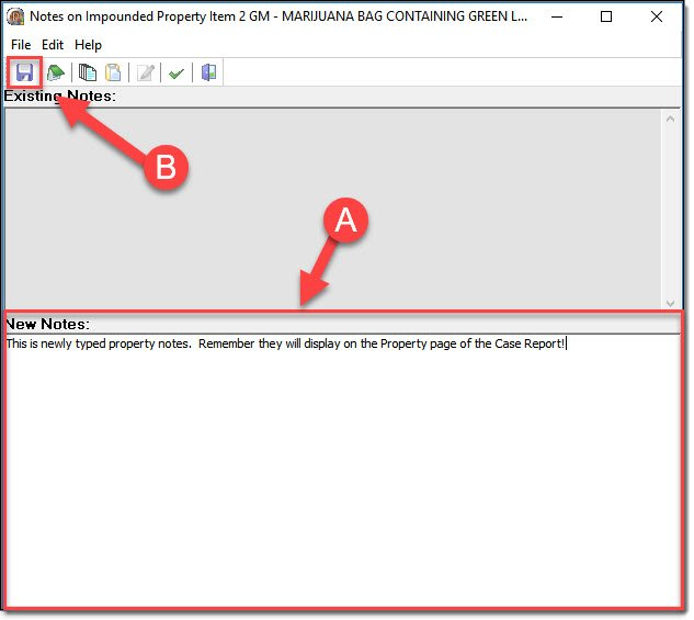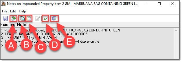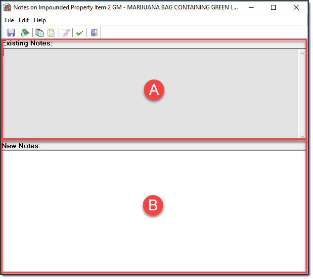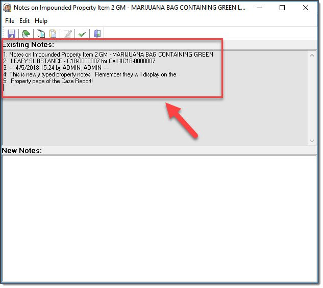 Individual property items can have notes attached. Please be aware that these notes do not function in the same manner as other notes in the RMS. Property notes will display on the Property page of the Case Report!