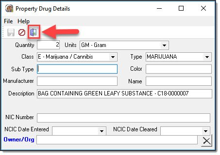 For the Vehicle, Firearms, Jewelry, and Other (Non-Specific) property types, you must select the “Choose” button on the details window. Drug property doesn’t have a choose button because the property doesn’t go through the search process.