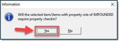- The roles; “EVIDENCE”, “FOUND”, “IMPOUNDED”, and “RECOVERED”, will ask if the property requires check-in.