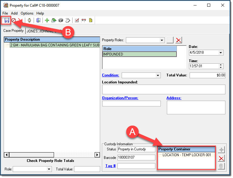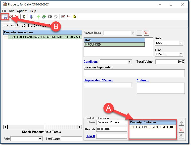 - Property in Custody – The property is in your agency’s control. E.g. The property was taken by your agency and was placed in a temporary evidence locker (or equivalent).