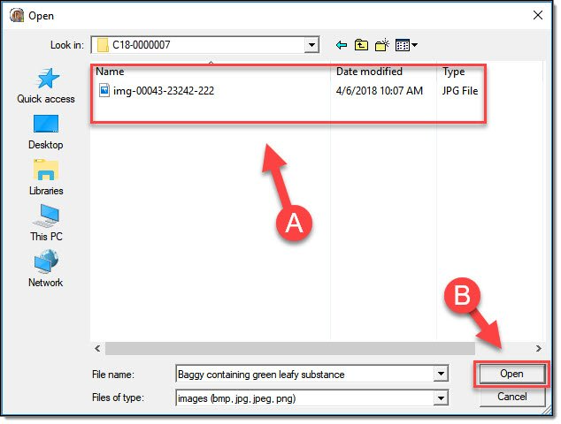 3. In the Open File dialog window, browse to and select the desired photo (A) and then select the “Open” button (B).