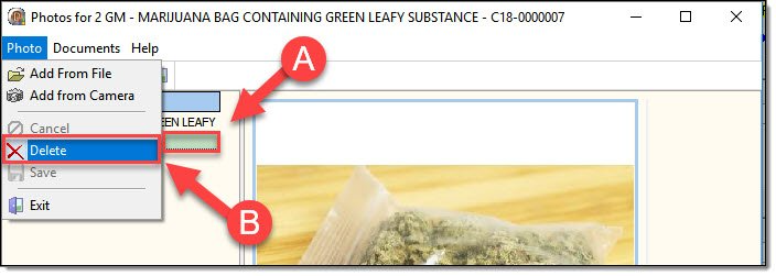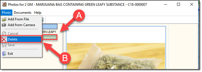 1. Occasionally, photos may get added to the wrong property item or a user may need to remove a photo. To delete a property photo, highlight the property item in the grid (A) and then select the “Delete” option found under the Photo drop down list (B).