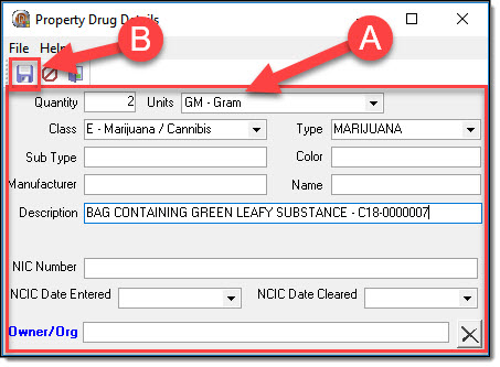 3. In this example, Drug property will be added to the call-for-service. Enter the property details (A), and then click the “Save” button (B) to save the property record.