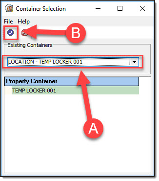 - Property Storage Container – Storage Container name/location for property items requiring check-in. Follow the steps below for instructions on selecting a Property Storage Location.