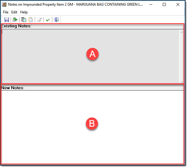 2. Existing property notes will be displayed in the top section of the Property Notes window (A). New notes can be entered directly into the bottom section of the Property Notes window (B).