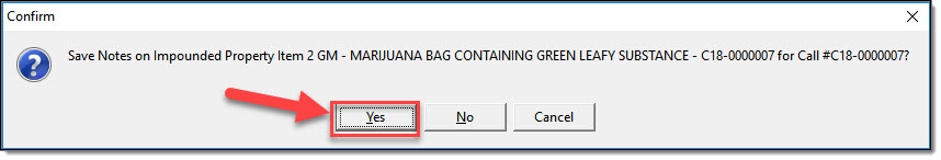 2. If the property is in possession of the agency and is going to the evidence room or temporary evidence locker, click “Yes” in the information box.