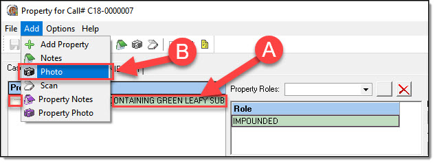 1. To add an image to a property item, highlight the item in the grid (A) and then select the “Photo” option under the Add drop down list (B).