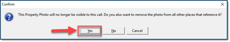 - No – Removes the property photo from the call, but the photo is still attached to the property item and visible in other areas of the RMS such as the Master Property Index and the Property Management module