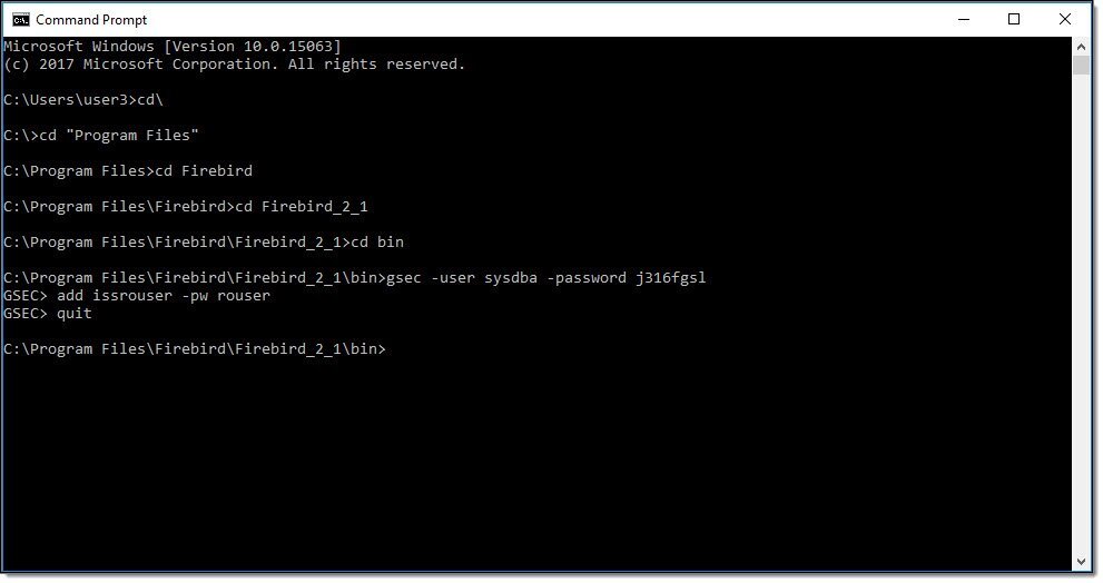 Open a new CMD window and navigate to the bin directory of the Firebird installation. In this example the bin directory is located: “C:\Program Files\Firebird\Firebird_2_1\bin”