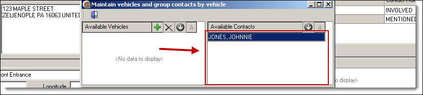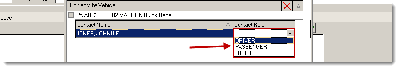 2. Once a contact has been related to a vehicle, they will both display in the bottom half of the Contacts by Vehicle window. Click in the Contact Role box to select whether the person was a Driver, Passenger, or Other.