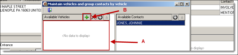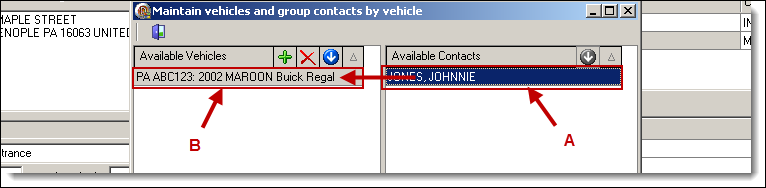 3. The left side of the Contacts by Vehicle window shows available vehicles (A). To add a new vehicle, click the “Add” button (B).
