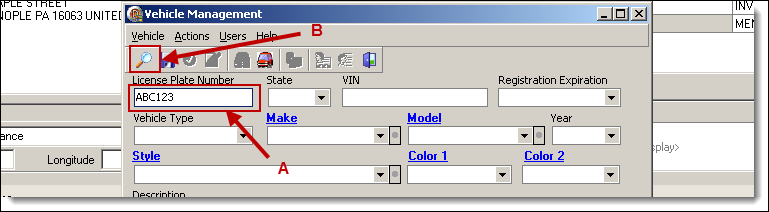 4. Enter part of the license plate number (A), and then click the “Search” button (B).
