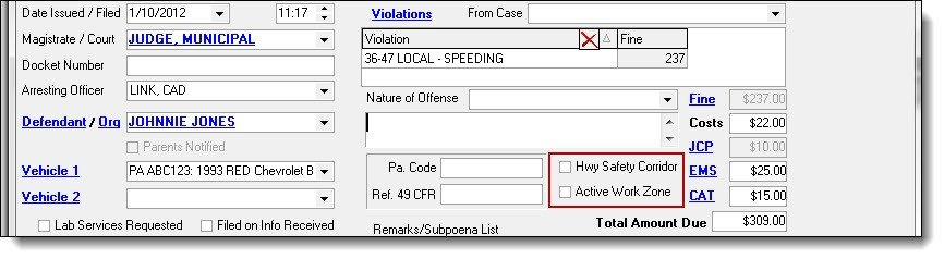 3. Checkboxes for Hwy Safety Corridor and Active Work Zone are available next to the fines and costs section of the citation.