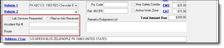 1. The Traffic Citations window has fields for recording additional information. On the left-hand side of the window, fields for recording Lab Services, Filed on Info Received, Accident Report #, and Route are available.