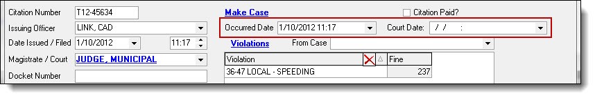 2. The top right of the Traffic Citation window allows users to record the occurred from and court dates/times.