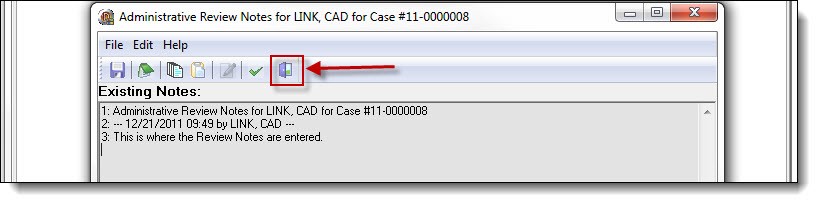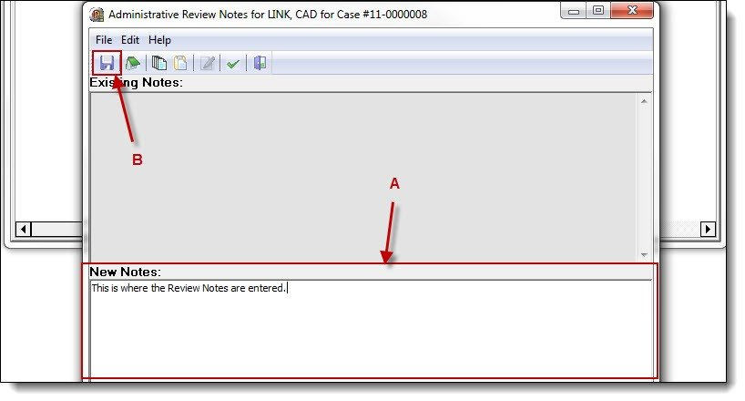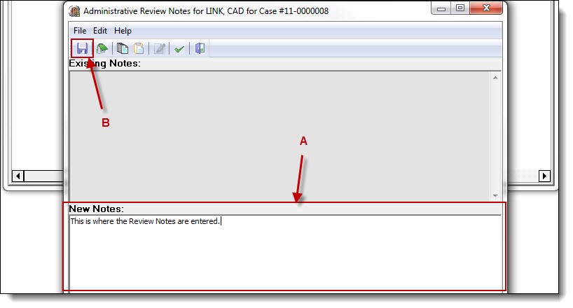 2d. Enter the review notes into the New Notes section of the editor (A), then click the “Save” button (B).
