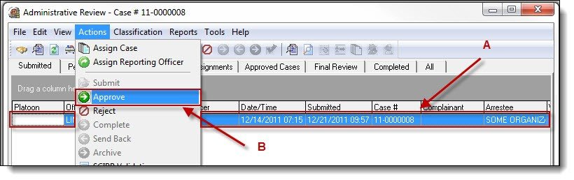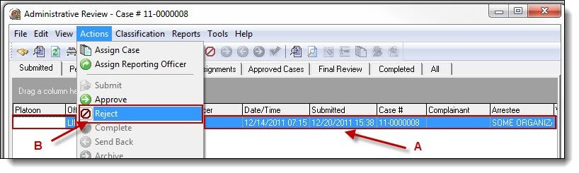 2a. After reviewing the case assignment, incomplete work or reports not matching the agency’s standards can be rejected back to the submitting officer. Highlight the case assignment that will be rejected (A), and then select “Reject” from the Actions drop down list (B).
