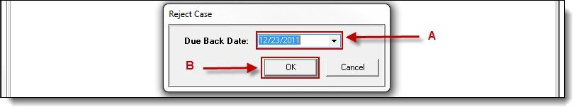 2b. Rejected assignments can be issued a “Due Back Date”. If the rejection requires a Due Back Date, enter the information into the Date field (A), and then click the “Ok” button (B). If the rejection does not require a Due Back Date, leave the Date field blank, and then click the “Ok” button (B).