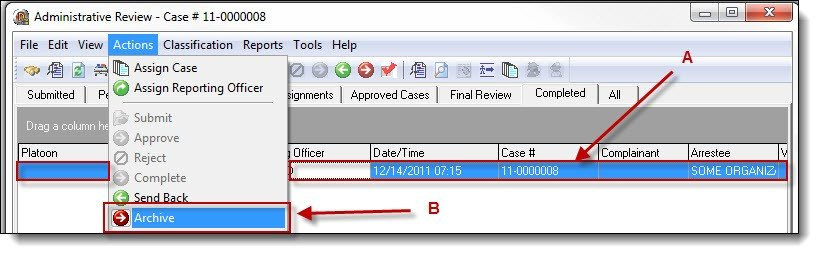 1. The final step in a case’s life-cycle is archiving. Depending on the size of the agency and the case volume the agency encounters, users may need to increase or decrease the frequency with which they archive cases. Users can archive a single case by highlighting the case in the Completed tab (A), and then select “Archive” from the Actions drop down list (B).