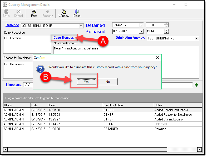 Now that you saved you can associate this record to a case by clicking Case Number (A) and then choosing Yes (B)