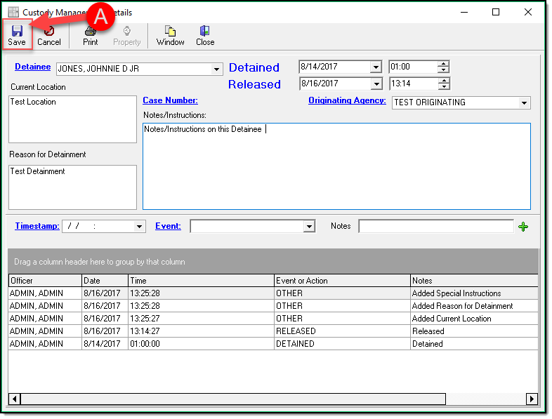 Once you have entered your Detainee, Detainee dates/times, location, reason, notes, and originating agency it is now time to save (A).