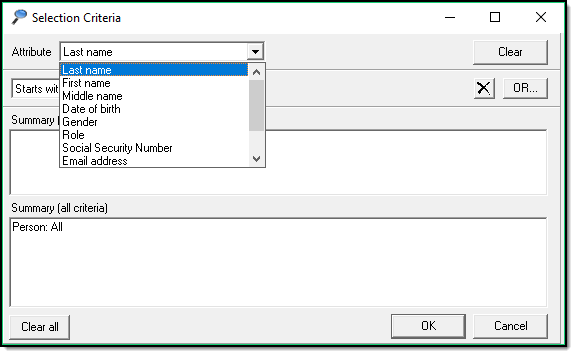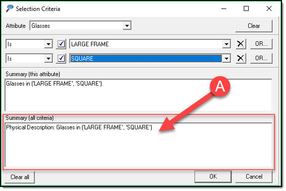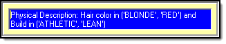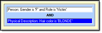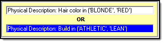 Another example of OR-criteria is shown within an attribute. For example, you could search Physical Descriptions for people with Blonde hair or Brunette hair or Red hair.