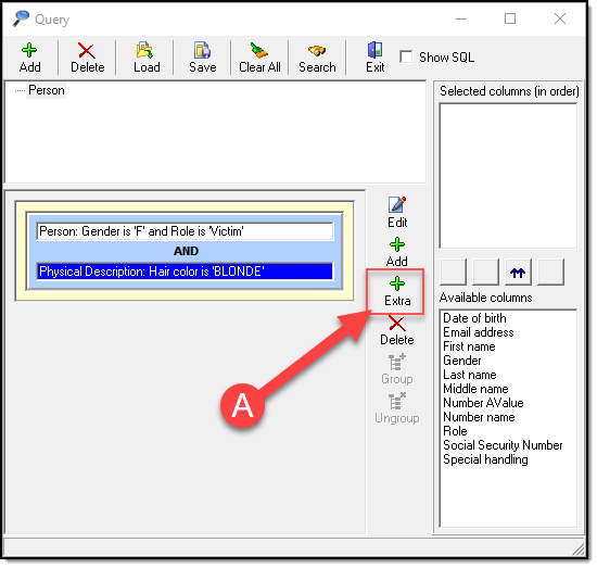 The lower Extra button (A) is for creating “AND” or “OR” relationships among major categories. So, if you wanted to search for Female Victims (Person attributes) with blond hair (Physical Description attribute), you would build the Person criteria, and then Add Extra Physical Description criteria.