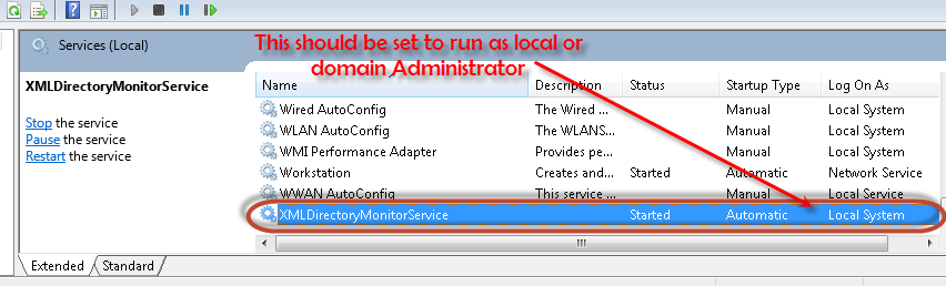 - Once the directory monitor service is installed please configure to run as a local or domain administrator.