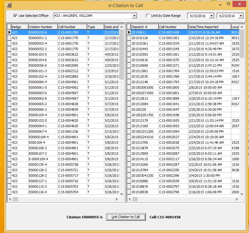 This tool is called “ecitetocall.exe” and it maps a citation to an existing call. Listed below, is a screen shot of the interface. The purpose of this tool is as a workaround until the next release, where the function to link citations to calls will be improved to transfer data from the citation to the call.