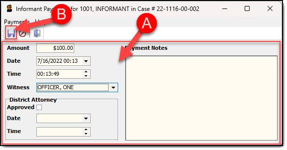 3. The Payment window has fields for recording: Amount, Date/Time, Witness, District Attorney Approval, and Notes information. Enter the payment information (A), and then click the “Save” button (B).