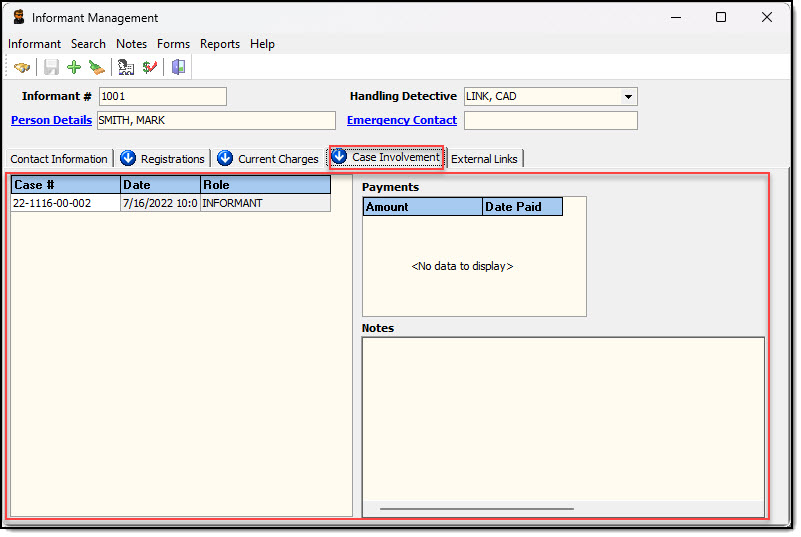 1. The Case Involvement tab displays any calls or cases in which the confidential informant is a contact with the role of informant.