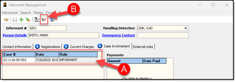 2. The Case Involvement tab also allows the user to record any payments that were made to the Informant. Highlight the call/case number from the grid (A), and then click the “Payments” button (B).