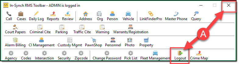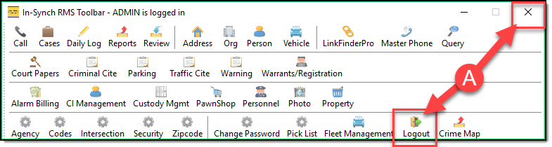 After you change your password you should log out of the toolbar by either hitting the X in the upper right or choosing the log out option (A) on the toolbar.