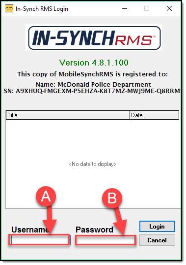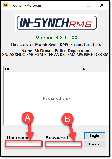 Once logged out re-launch the In-Synch RMS toolbar and enter your Username (A) and your New Password (B)