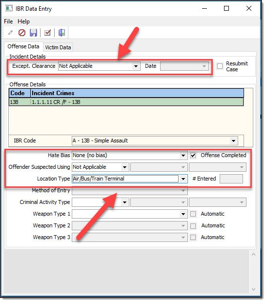 IBR Data Entry Window, Offense Data Tab: Exceptional Clearance (If exceptionally cleared, you must enter the date of exceptional clearance.), Bias Motivation, Offense Attempted/Completed, Offender Suspected Using, and Location Type.