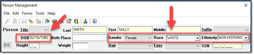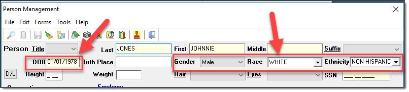Person Management Window:* Offender age (see additional option below), Sex, Race and Ethinicity. IF YOU DO NOT HAVE A DOB OR AGE RANGE, LEAVE BLANK.