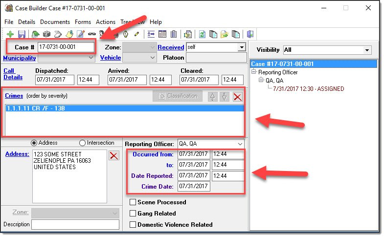 Case Builder Main Window: Incident Number, Crimes, Incident Date/Time, and Date/Time Reported.