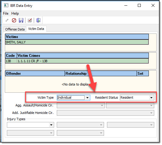 IBR Data entry Window, Victim Data Tab: Type of Victim. If individual is selected as the Victim Type – Victim Age, Sex, Race, and Ethnicity (Entered in Victim’s Person Management Window mentioned above). Optional: Residence Status of Victim.
