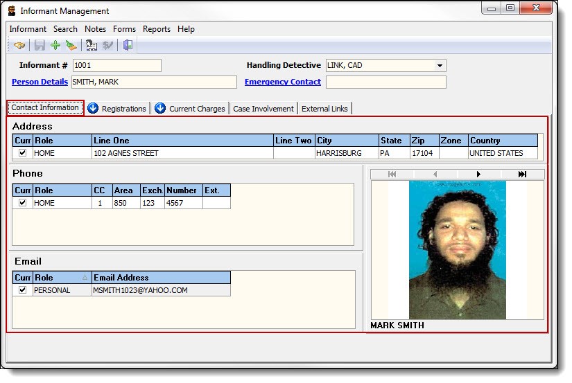 1. The Contact Information tab displays the informant’s addresses, phone numbers, email addresses, and photos. These items are pulled into CI Management from the contact’s person record. Edits must be made to the person record in order to reflect in the CI Management module.