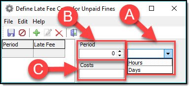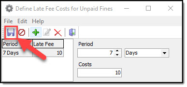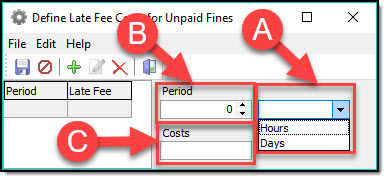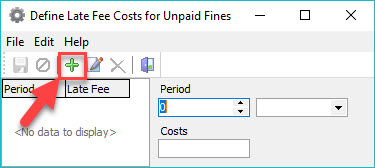 1. With the Code Management window open in edit mode, press the Costs button. This launches the ‘Define Late Fee Costs for Unpaid Fines’ module.