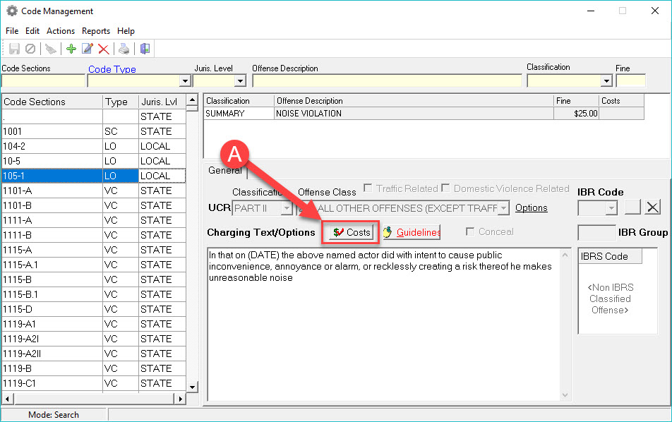Costs can only be set on crimes codes that have had a fine set. To start, select a crimes code that has a fine, and then press the edit button.