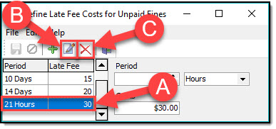 6. To correct, or remove a late fee, select the Cost listing you wish to change (A), and then press the edit button (B). To remove the Cost entirely, press the delete button ( C ).