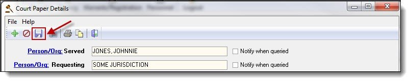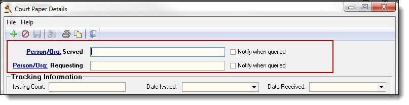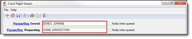 The “Notify when queried” checkbox allows you to flag the person as being part of a civil paper. If the box is checked, any user searching that person’s/org’s name will be notified of the paper throughout the RMS.