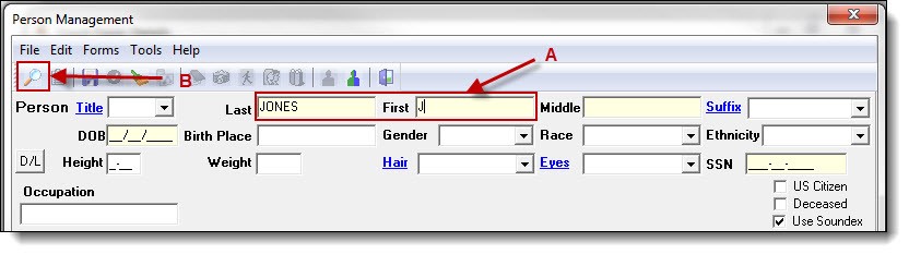 3. Enter part of the person’s last name, first name, or both (A), then click the “Search” button (B) to see if the person exists in the database.
