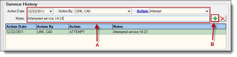 8. The third section is for recording actions or service history on the paper. Using the drop down lists and text field enter the service action (A) and then click the “Add” button (B).