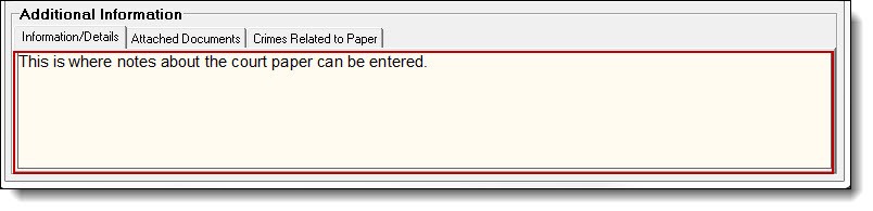 10. The Information/Details tab has a field for recording notes about the court paper.